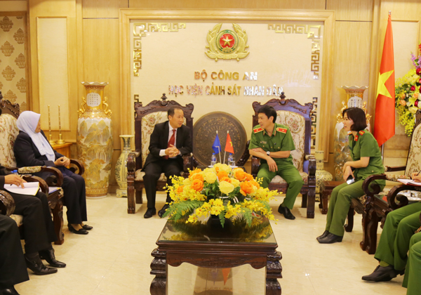 On August 14th, 2018, with the approval of the Ministry of Public Security, the PPA hold a meeting to exchange experience on training and scientific research with the delegation of Indonesian Traffic Police led by Brigadier General Halim Pagarra - Director of Registration and Identification.